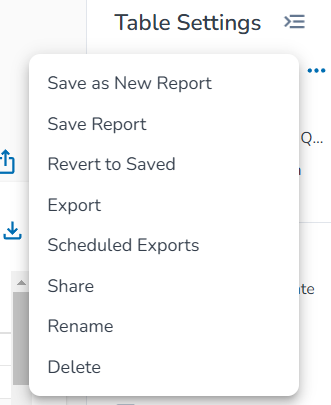 Right below the Table Settings header on the right, click on the ellipsis menu to expand the Saved Reports menu. You'll then have the options to: