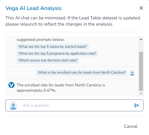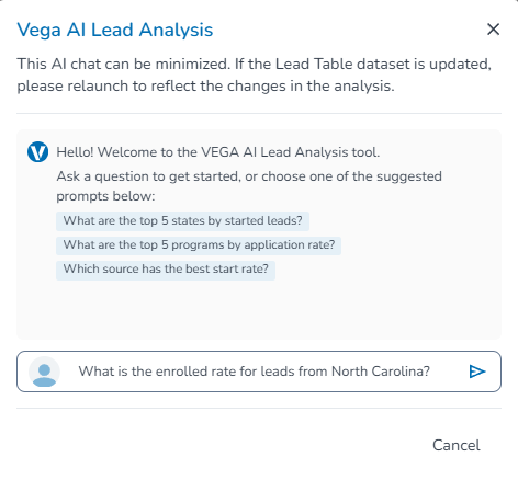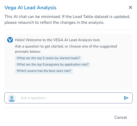 Clicking Cancel will close the Chat box, but as long as your browser stays on the Leads tab, the AI Chat will be available to re-open your session history with that dataset at anytime. If you leave Leads, you can return at a later time to re-load a dataset and start a new chat session.