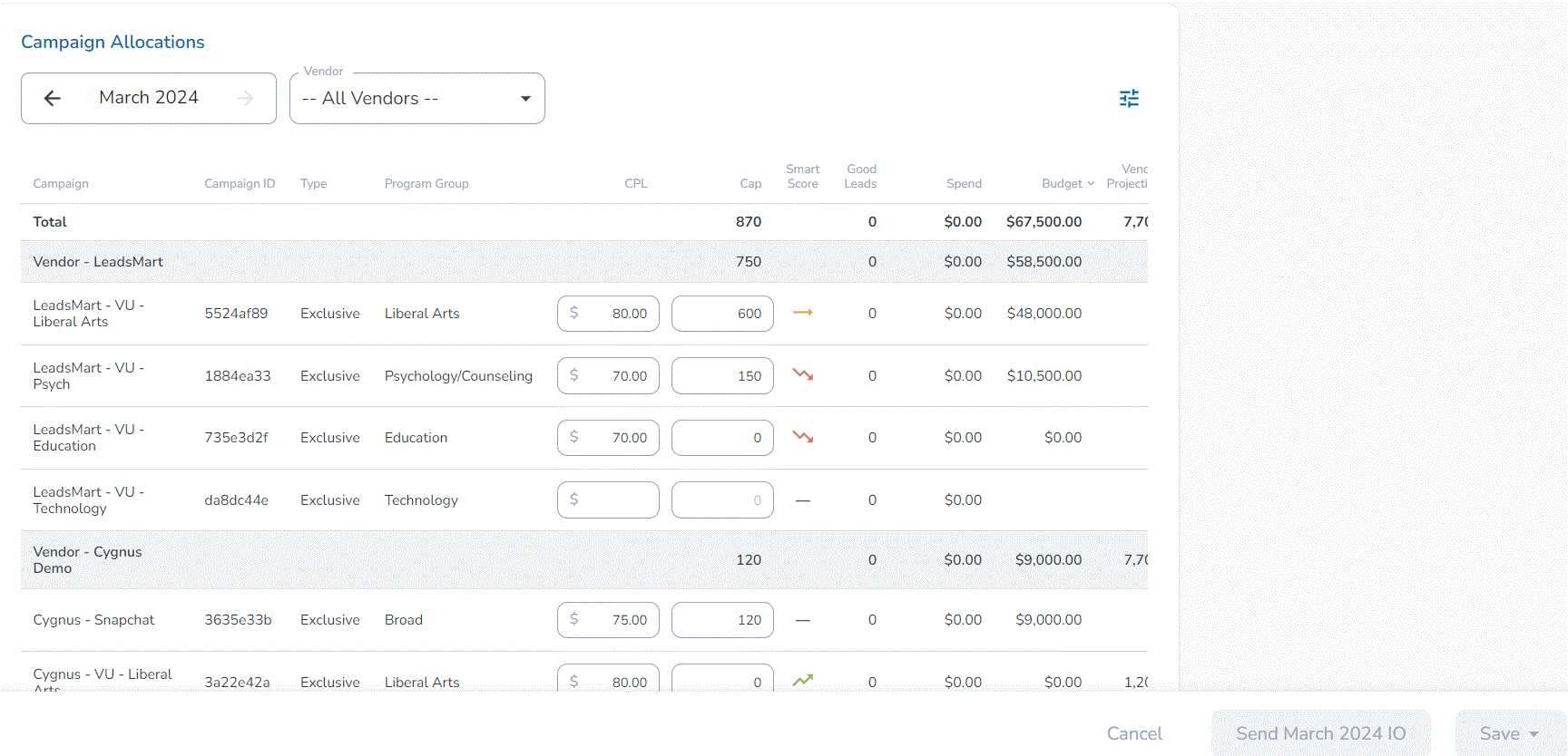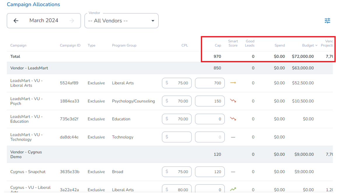By selecting Manage in the menu and navigating to the Allocations tab you're able to update CPLs and Caps for your campaigns in the default All Vendors view or by selecting individual vendors from the dropdown as needed.