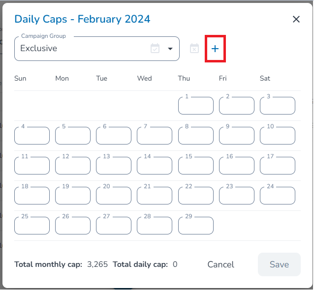 - After clicking the calendar icon, click the + button next to the Campaign Group dropdown in the modal: