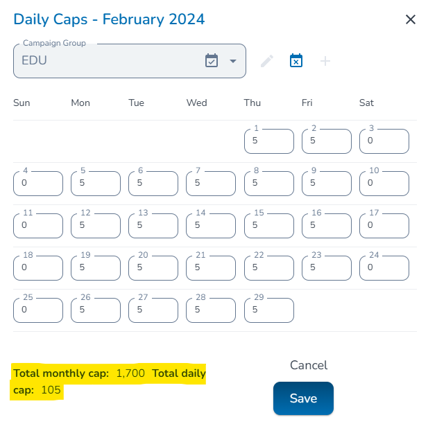 - Counters at the bottom of the modal display the total monthly cap for the campaigns within the group and the total cap based on the settings for each day.