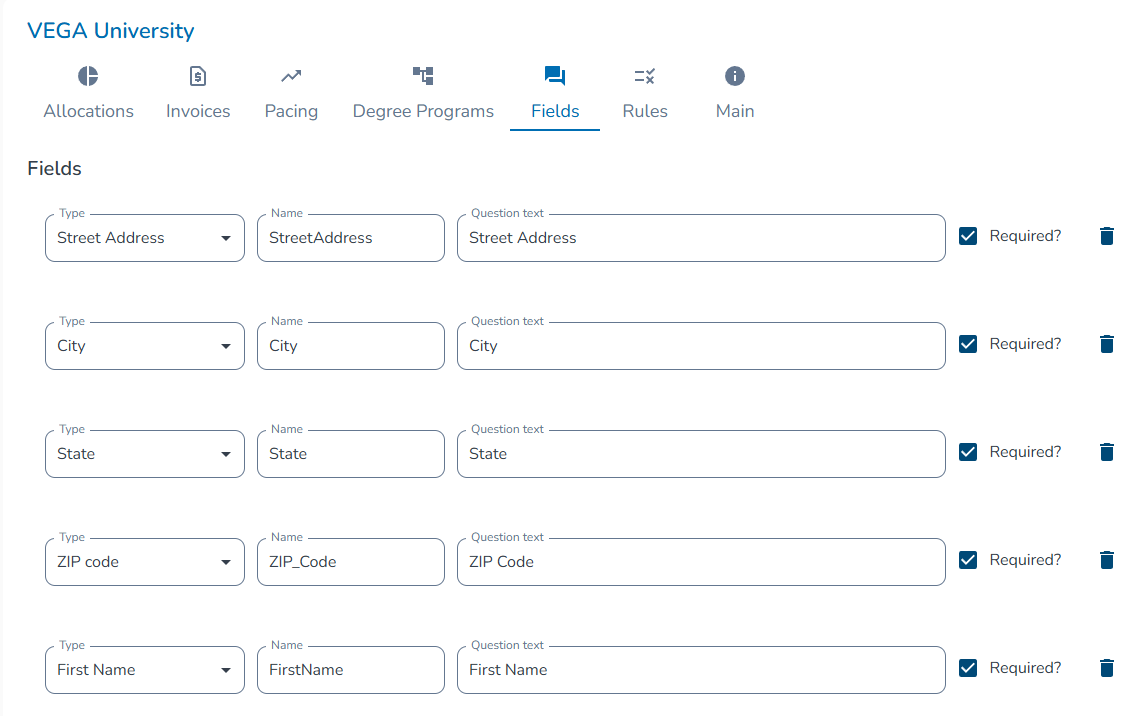 - It's recommended that when adding a new field, disable the Required? checkbox to avoid leads being rejected prior to vendors being able to add the field.