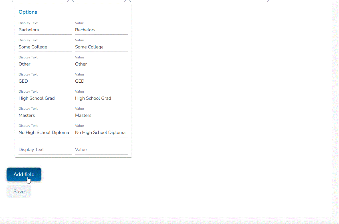 - For Custom drop-down fields you'll be shown a secondary listing where you'll enter the labels to display in the field dropdown along with the values to be posted to VEGA.Once you've added your field(s), you can click Save at the bottom of the list.