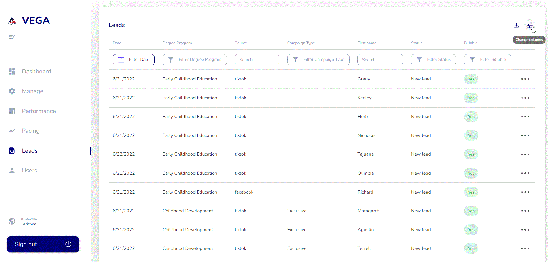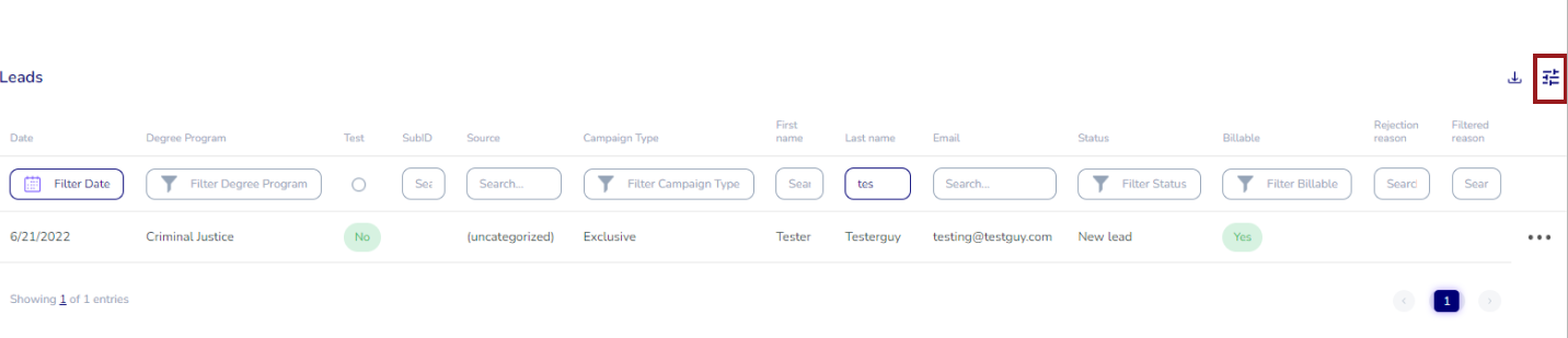 The Leads Table is the repository for all leads, including tests, that have been posted to VEGA. Below you'll find details for customizing and downloading your reports.