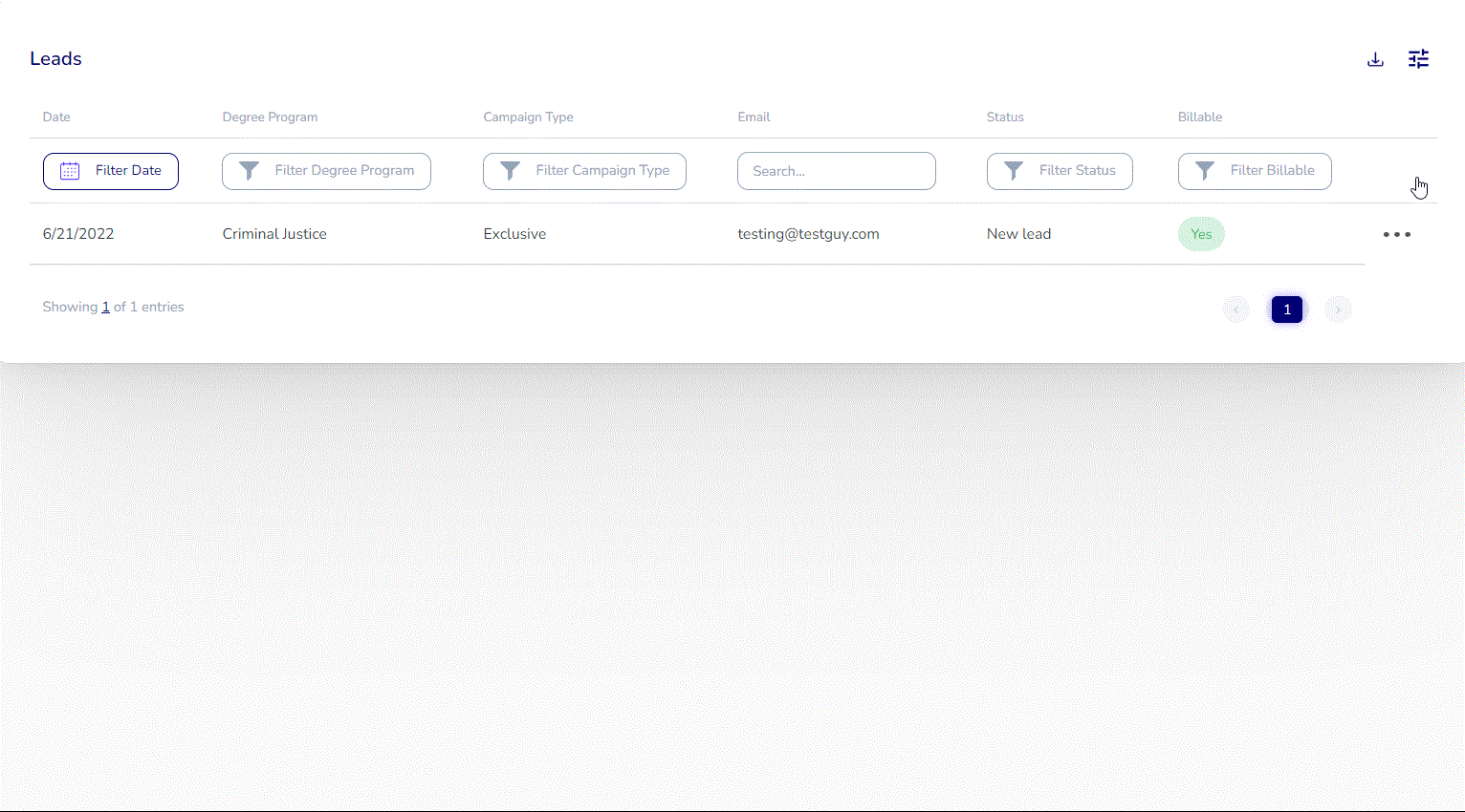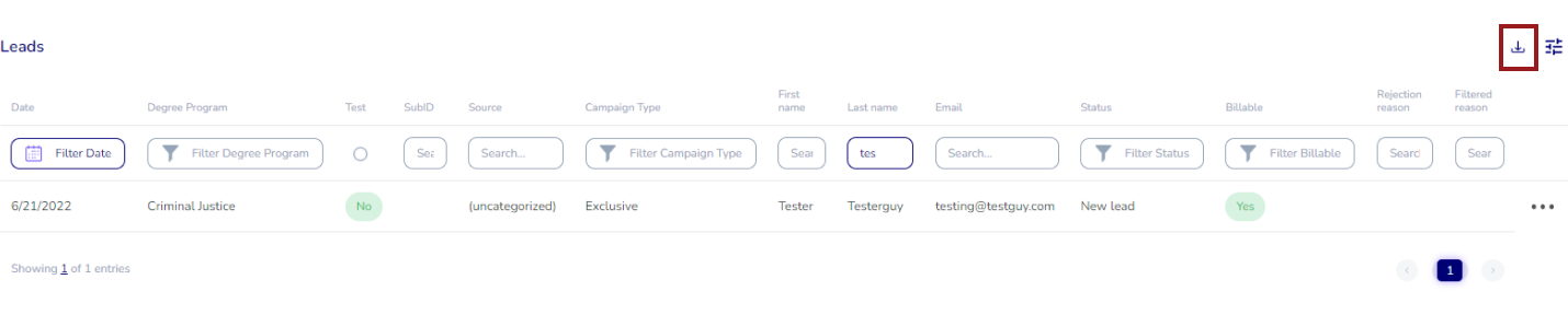 Simply click the download icon in the upper right to export a CSV file of the lead data: