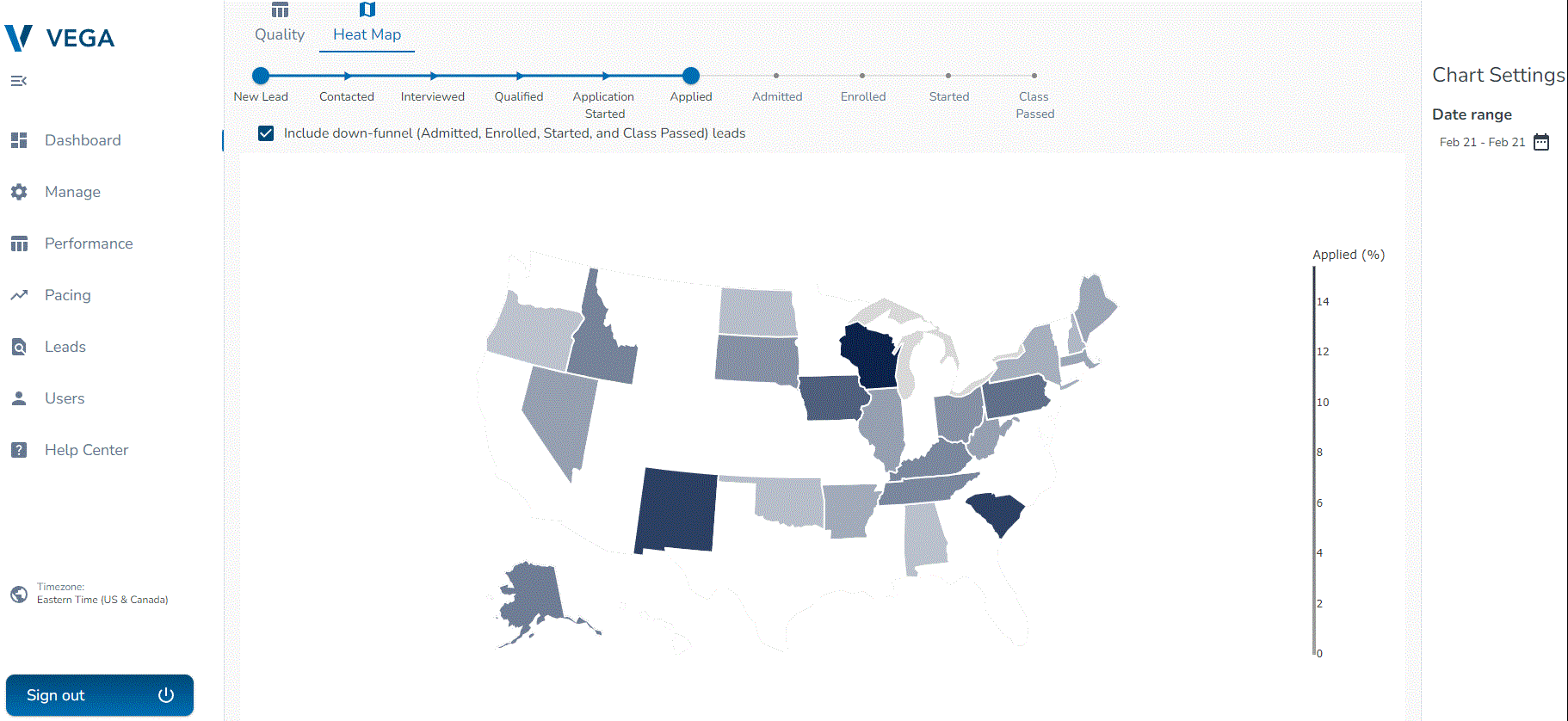 Under Performance in the VEGA menu, an interactive map of the United States that displays lead performance counts and percentages.