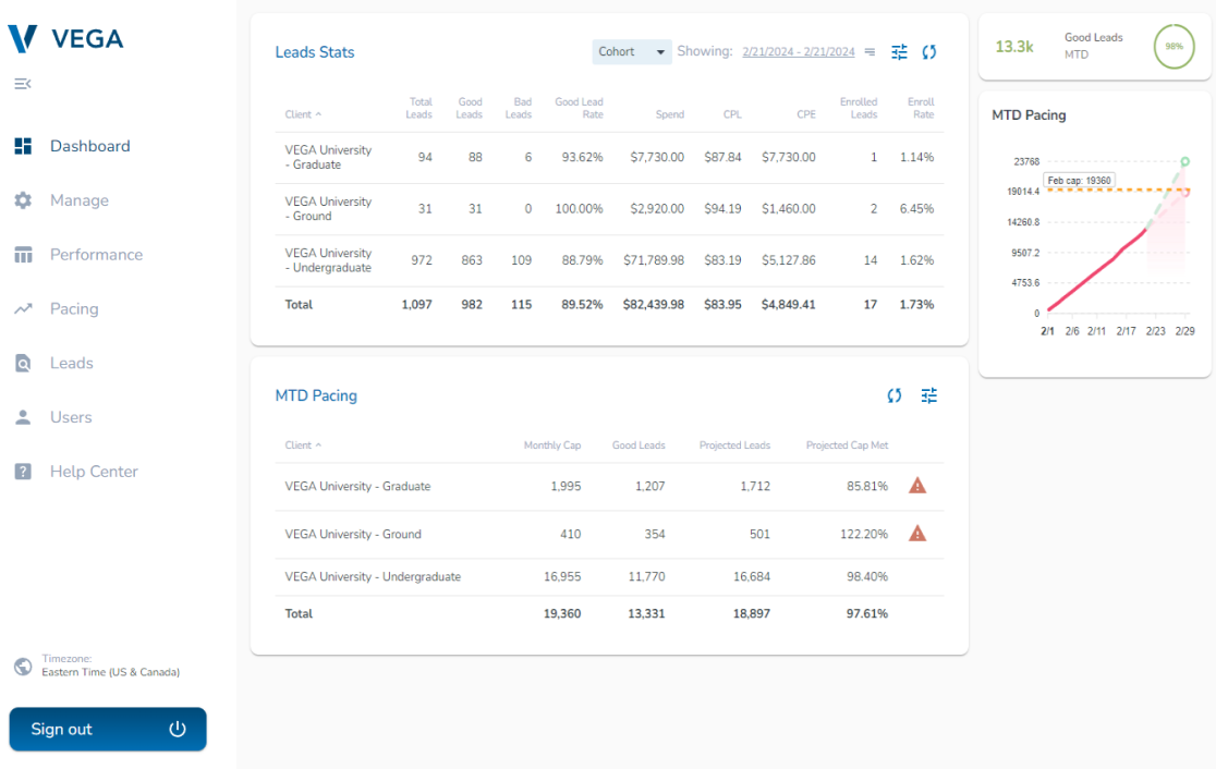 We've made it easy to change your timezone on the fly. All you need to do is click the Timezone hyperlink, select the timezone you want to view data in, and let VEGA take care of the rest.